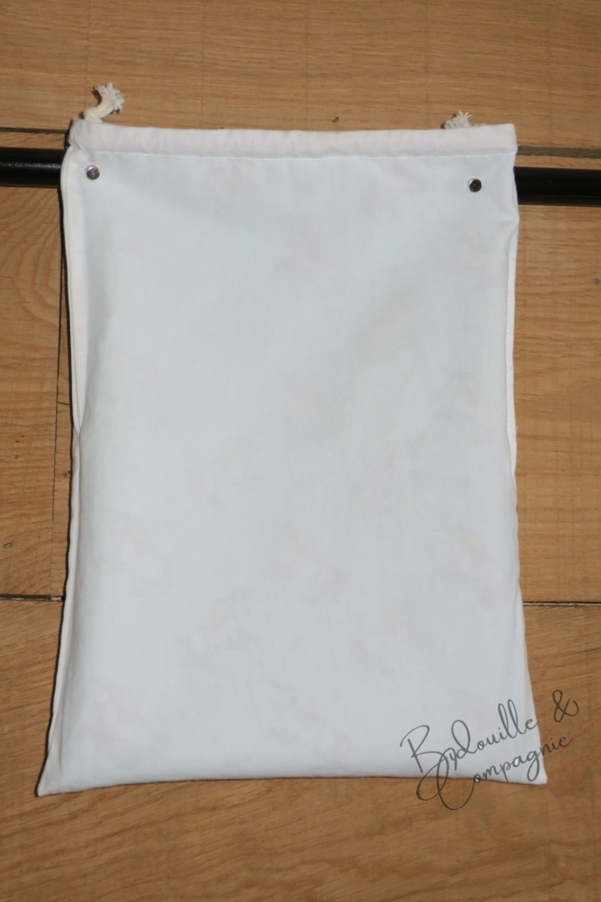 Le cachet noir est un cachet spécial textile (il ne se trouve pas sur tous les sacs). La mention "Bidouille et compagnie" qui apparait en blanc est une protection d'image qui n'apparait qu'à l'écran 😉